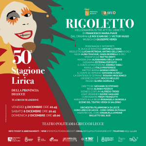Dopo il successo di “Aida”, va in scena la seconda opera del cartellone della 50^ Stagione Lirica della Provincia di Lecce - Teatro di Tradizione, in programma al Teatro Politeama Greco il 5 (ore 20.45), 6 (20.45) e 7 dicembre (ore 18): “Rigoletto” di Giuseppe Verdi.