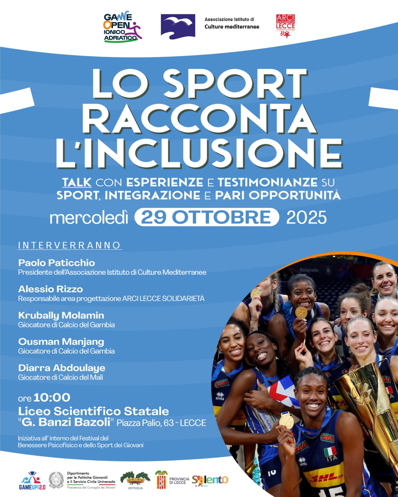 Martedì 29 ottobre, presso il Liceo Scientifico “Banzi Bazoli” di Lecce, è in programma l’evento “Lo sport racconta l’inclusione” organizzato dall’Associazione “Istituto di Culture Mediterranee”, partner di GAME Open Ionico-Adriatico, progetto promosso e coordinato dalla Provincia di Lecce, con il sostegno dell’Unione Province d’Italia e finanziato dalla Presidenza del Consiglio (Dipartimento per le Politiche Giovanili e il Servizio Civile Universale) dal Programma GAME UPI 2.0.
