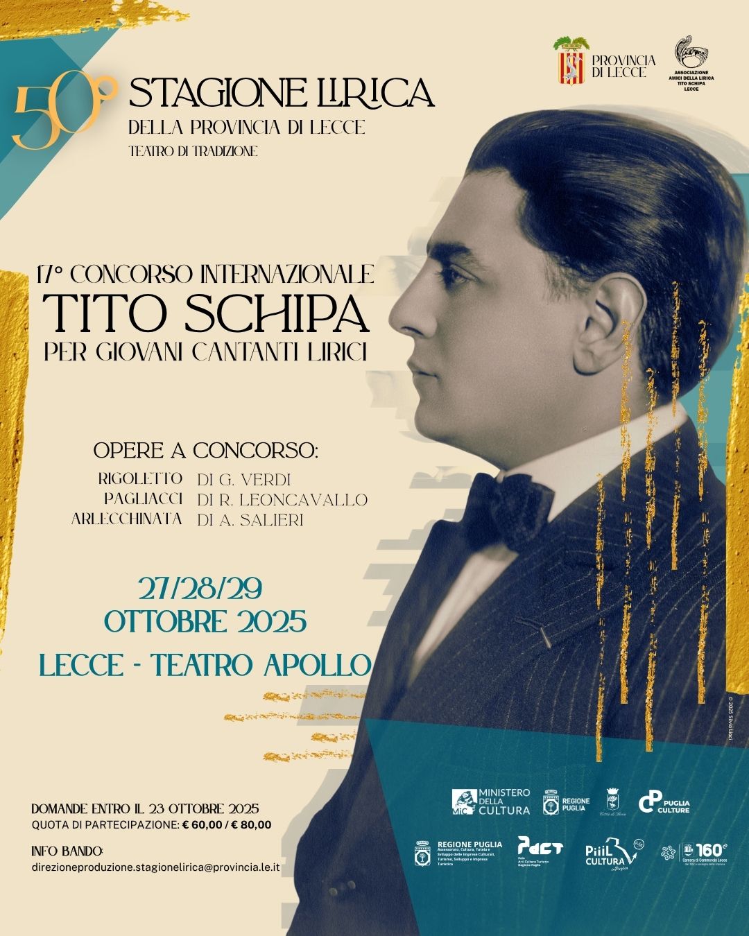 Le iscrizioni al Concorso, organizzato e promosso dalla Provincia di Lecce e dall’Associazione Amici della Lirica “Tito Schipa” di Lecce, sono aperte fino al prossimo giovedì 23 ottobre.