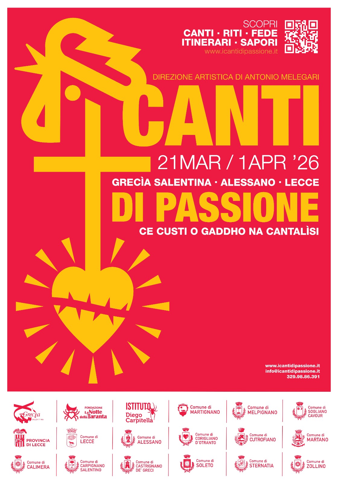 Dodici giorni di eventi, quindici appuntamenti, oltre trecentocinquanta artisti coinvolti. E’ questa “Canti di Passione - Ce Custi o Gaddho na Cantalisi”, rassegna promossa dall’Unione dei Comuni della Grecìa Salentina con la partecipazione dell’Istituto Diego Carpitella, partner Fondazione La Notte della Taranta, e con il patrocinio della Provincia di Lecce.