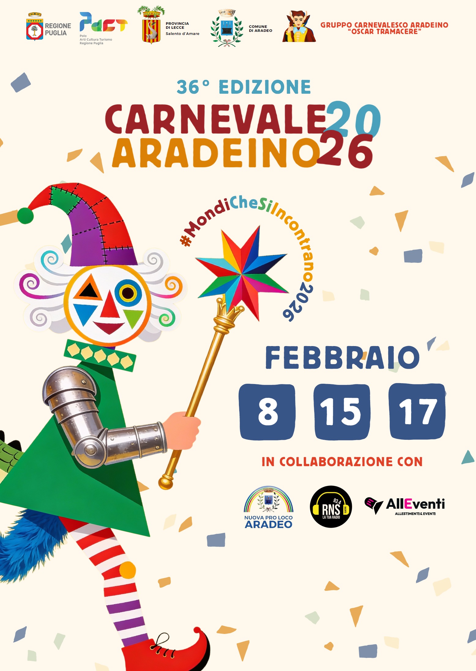 In programma tra l’8, il 15 e il 17 febbraio prossimi, sfilate e iniziative del Carnevale di Aradeo si svolgeranno nel centro cittadino, con palco principale allestito in Piazza San Nicola e il percorso lungo Viale della Libertà, dove sarà possibile ammirare 12 carri di cartapesta e numerosi gruppi mascherati.