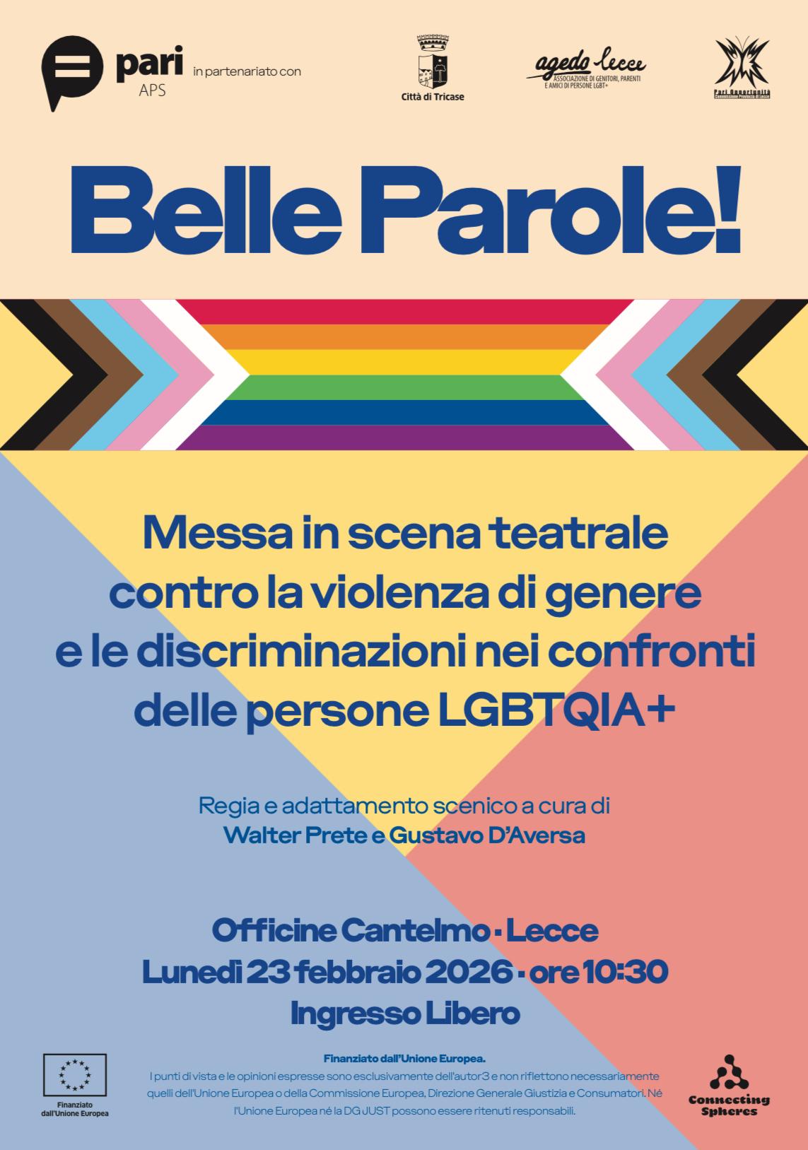 Lunedì 23 febbraio, alle 10.30, sul palcoscenico delle Officine Cantelmo, a Lecce, andrà in scena “Belle Parole!”, opera teatrale realizzata nell’ambito del progetto che si propone di contrastare violenza di genere e stereotipi contro le persone LGBTQIA+, adottando una prospettiva intersezionale e valorizzando il protagonismo giovanile.