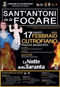 La festa avrà il suo culmine sabato 17 febbraio. Alle ore 19, infatti, dopo la messa, si svolgerà la processione in onore di Sant’Antonio tra le vie cittadine e la benedizione delle “focare”. Al termine sarà acceso il falò più grande, allestito in piazza Municipio. La focara centrale e di comunità quest’anno festeggia i 30 anni dalla prima accensione. Alle 21 lo spettacolo di fuochi pirotecnici e alle 21.30, gran finale con l’esibizione dell’Orchestra Popolare La Notte della Taranta.