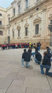 Il silenzio iniziale è stato rotto dalle note e dai movimenti a ritmo di musica delle studentesse e degli studenti della Street Band del Liceo Palmieri di Lecce, accompagnati dal docente Gianni Epifani, che ha animato il flasmob, richiamando l’attenzione dei passanti.