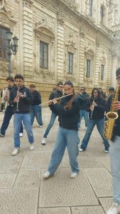 Il silenzio iniziale è stato rotto dalle note e dai movimenti a ritmo di musica delle studentesse e degli studenti della Street Band del Liceo Palmieri di Lecce, accompagnati dal docente Gianni Epifani, che ha animato il flasmob, richiamando l’attenzione dei passanti.