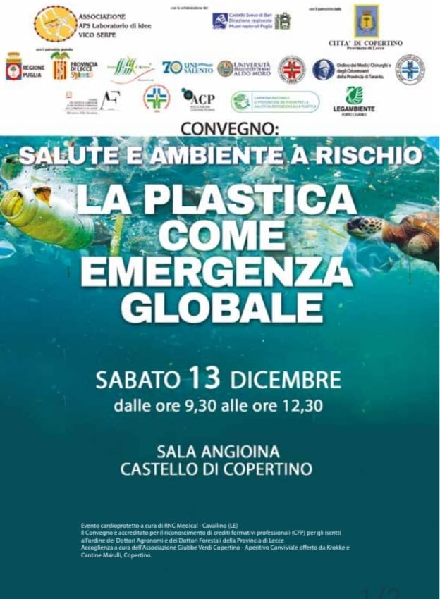 L’evento, in programma sabato 13 dicembre, presso la Sala Angioina del Castello di Copertino, è promosso dall’APS Laboratorio di Idee Vico Serpe, in collaborazione con la Direzione Regionale dei Musei Nazionali della Puglia, con il patrocinio di Provincia di Lecce, Comune di Copertino, Università del Salento, Università degli studi di Bari, Gal Terra d’Arneo, Ordine dei Medici di Lecce e Taranto, Ordine dei Veterinari di Lecce, Ordine dei Dottori Agronomi e Dottori Forestali di Lecce, International Society of Doctors for Environment (ISDE), Associazione Culturale Pediatri (ACP), Legambiente.