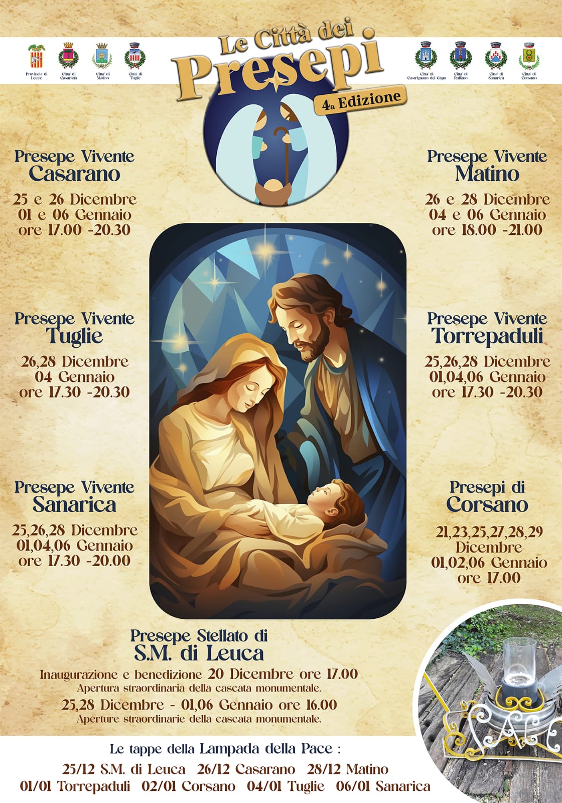 Non mancherà il percorso della lampada della pace, che sarà di volta in volta posta all’interno di ogni Presepe. Ecco le tappe: 25 dicembre a Santa Maria di Leuca, 26 dicembre a Casarano, il 28 a Matino, l’1 gennaio a Torrepaduli, il 2 gennaio a Corsano, il 4 a Tuglie e il 6 a Sanarica.