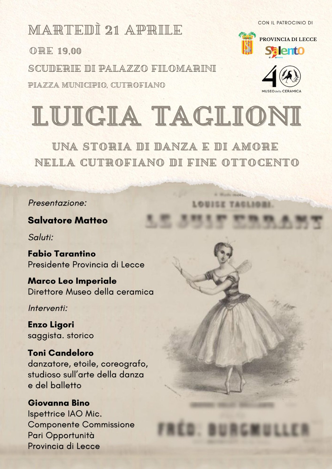 L’evento, che gode del patrocinio della Provincia di Lecce, intende ricordare la figura della prestigiosa ballerina di fama internazionale Louise (Luigia) Taglioni che, dopo il ritiro dalle scene, visse a Cutrofiano, dove morì nell’aprile del 1893.
