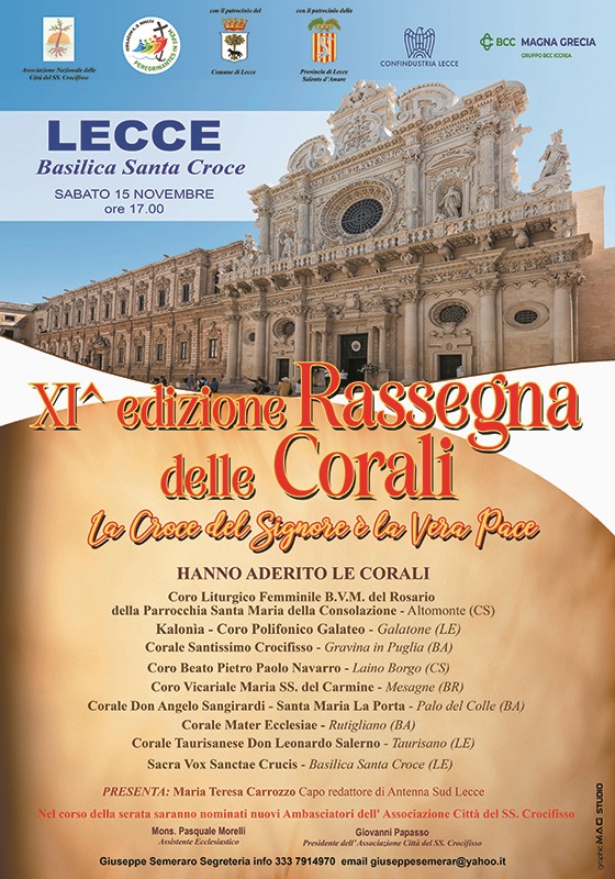 Lunedì 10 novembre, nella sala Conferenze stampa di Palazzo Adorno a Lecce, alle ore 11, verrà presentata la Rassegna dei Cori Parrocchiali delle Città del SS. Crocifisso, XI edizione, dal tema “La Croce del Signore è la vera Pace”,